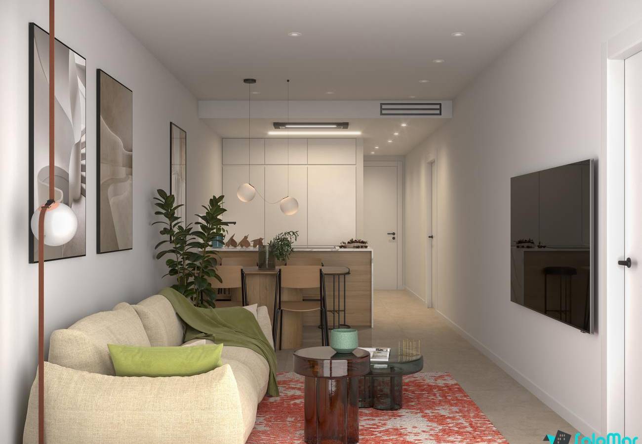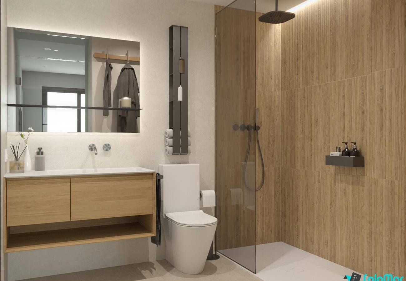This new residential complex is located in a quiet area very close to the sea. It comprises apartments with 2 bedrooms, 2 bathrooms, a kitchen, a living/dining room, and a terrace. Each apartment has pre-installation for air conditioning, built-in wardrobes in the bedrooms, electric blinds, a 110-liter aerothermal water heater, white doors, and porcelain tile flooring. The kitchen is furnished.