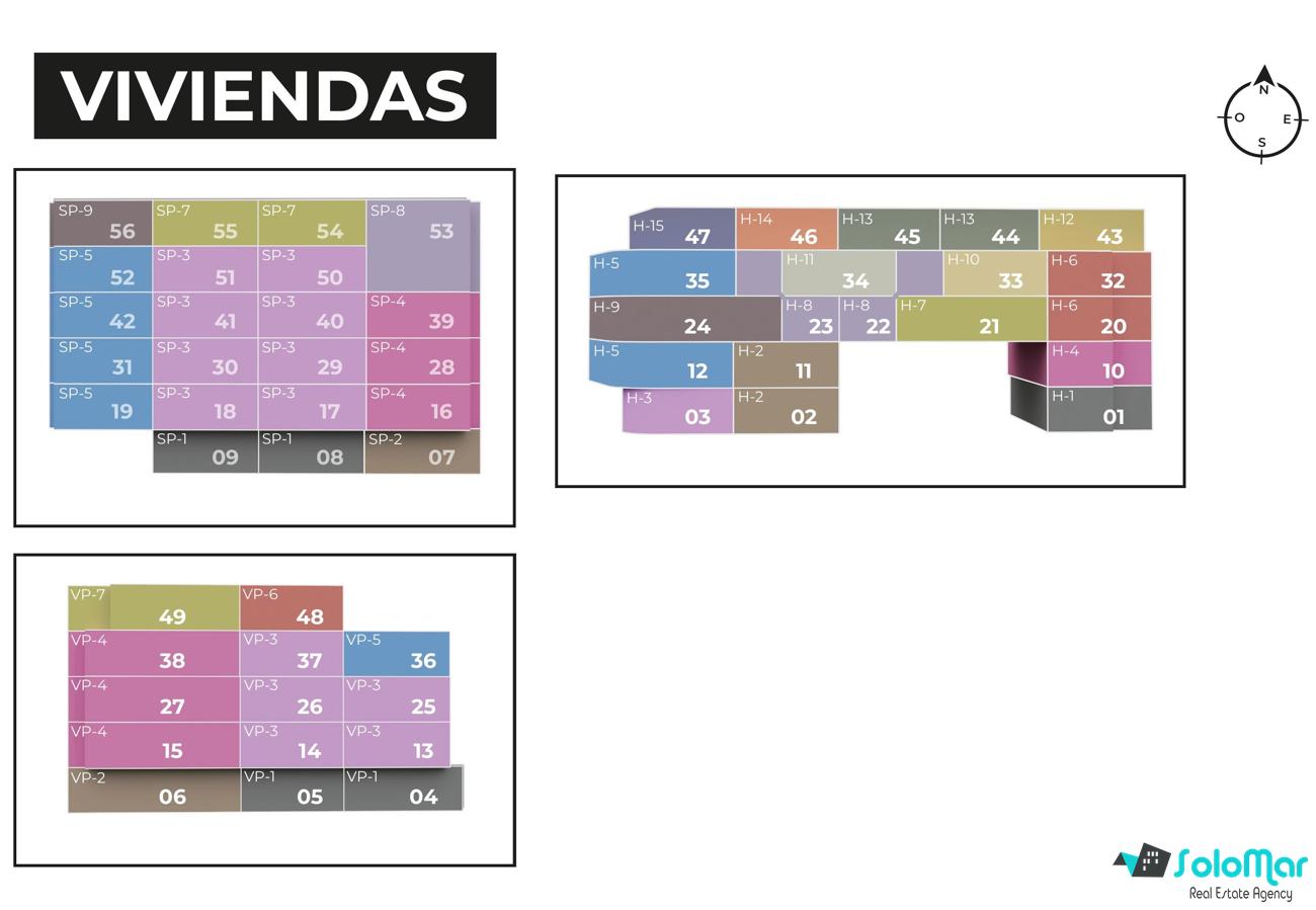 Woningen met 1, 2 en 3 slaapkamers met zeezicht, aerothermische verwarming, voorgeïnstalleerde airconditioning en volledig uitgeruste gemeenschappelijke ruimtes: een uitkijkpunt, een multifunctionele ruimte, een berging en een gemeenschappelijk toilet.