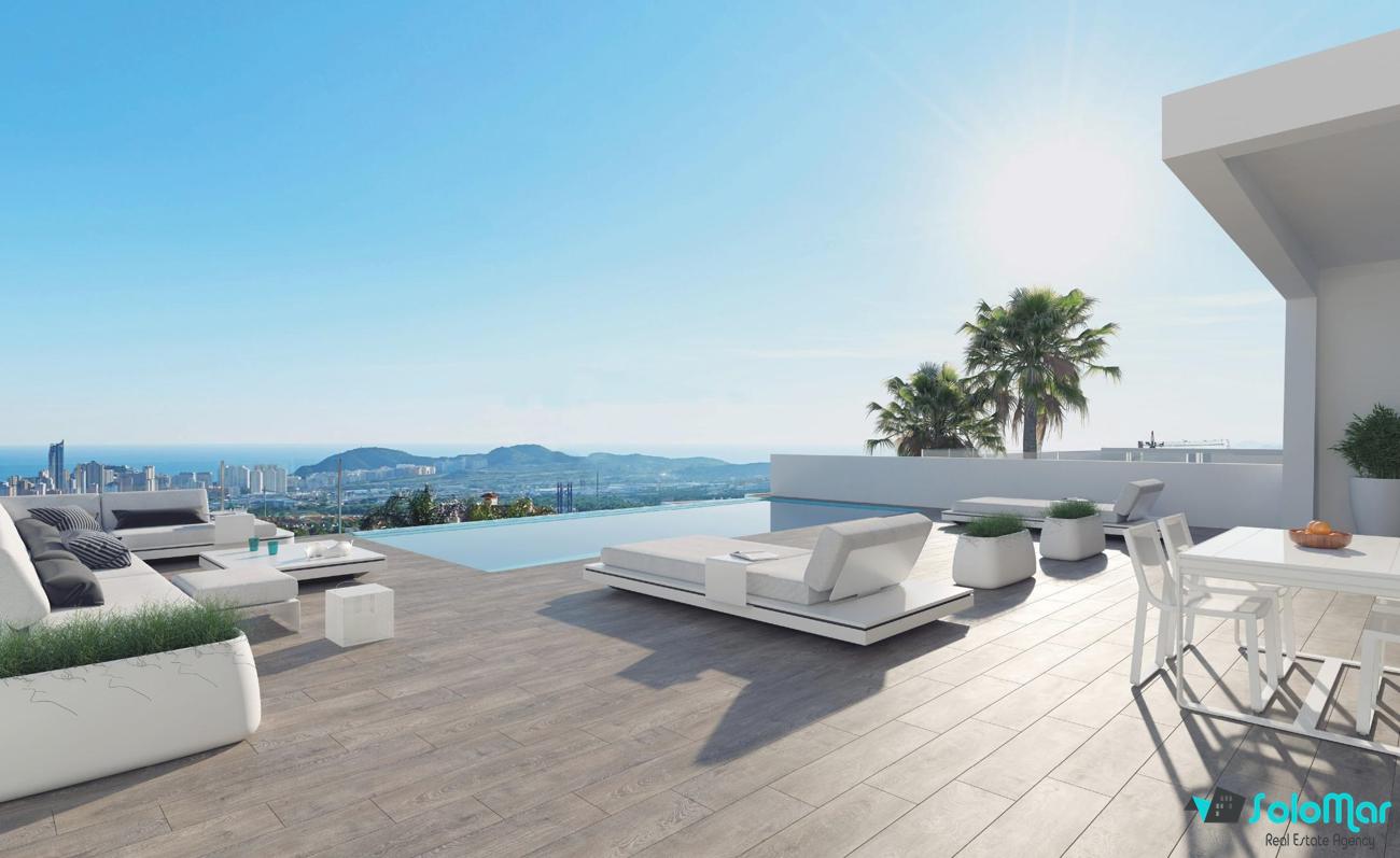Salida directa, desde la planta baja a la piscina y a la gran terraza, un lugar idílico para disfrutar de las puestas de sol y vistas al mar de Benidorm.