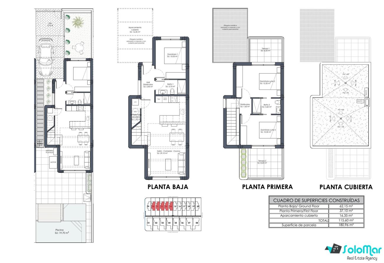 Las villas constan de salón, cocina amueblada, 3 dormitorios, 2 baños, con opción de sótano y solárium.
