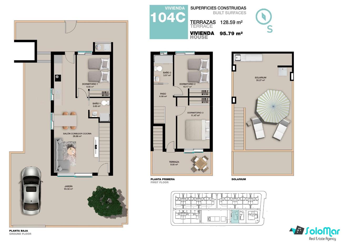 Este dúplex tiene consta de 3 dormitorios, 2 baños, salón, cocina moderna equipada con electrodomésticos, zona de jardín con plaza de aparcamiento y solarium grande.