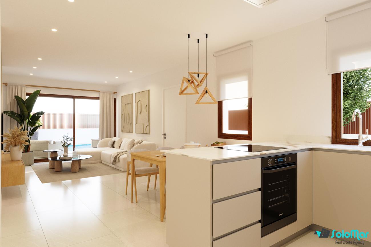 Cada vivienda cuenta con una parcela privada con espacio de aparcamiento, piscina individual de 5 x 2,5 metros y un diseño cuidado que incorpora materiales modernos tanto en interiores como en fachadas. La distribución, toda en planta baja, incluye una terraza con porche cubierto, una amplia zona de salón-comedor con cocina abierta, dos dormitorios con armarios empotrados y dos baños completos, uno de ellos en suite. Existe también la opción de añadir un solárium.