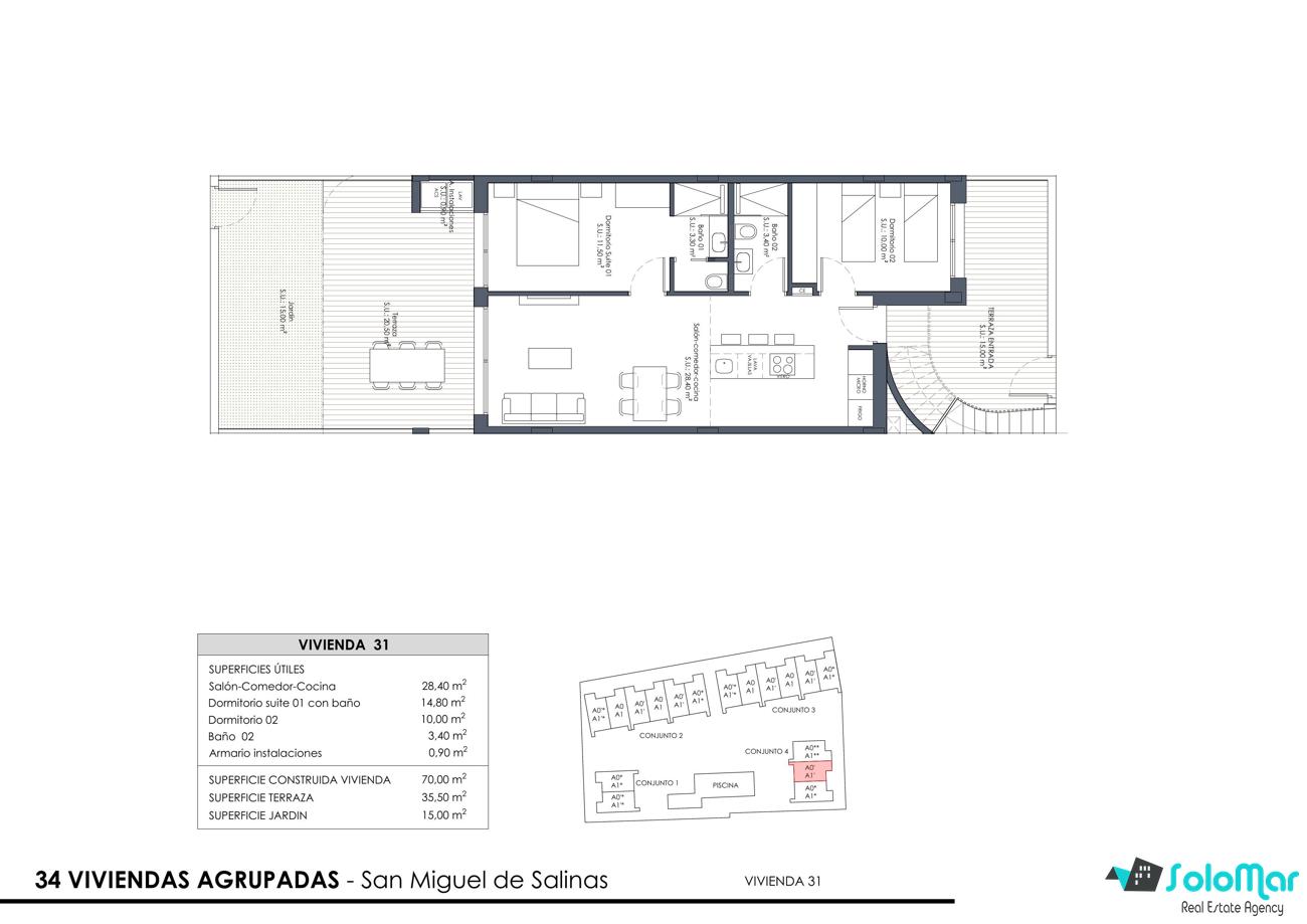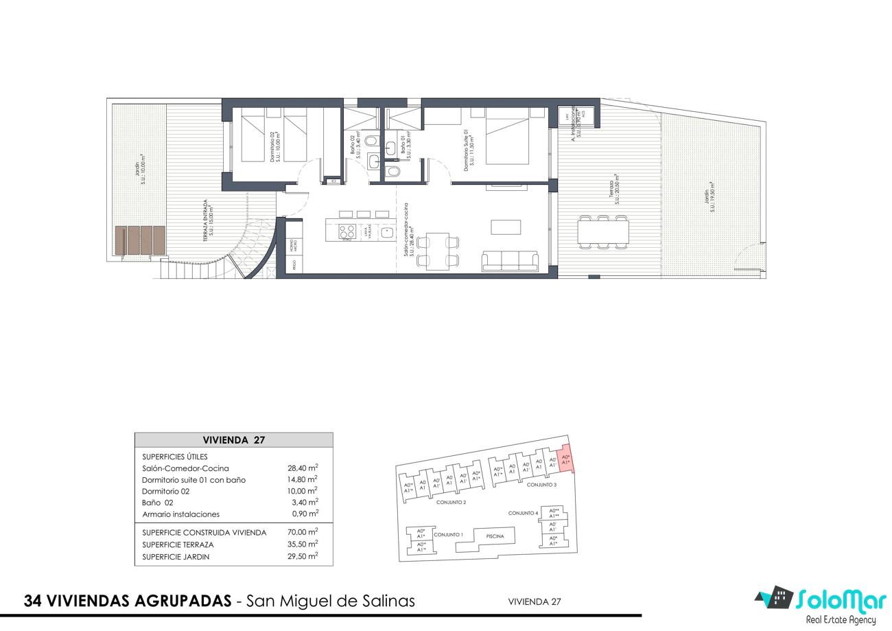 Se ofrecen dos tipologías de vivienda para adaptarse a distintos estilos de vida: las de planta baja, que disponen de un jardín privado ideal para relajarse al aire libre, y las de planta alta, que incluyen un solárium perfecto para disfrutar de las vistas y del clima mediterráneo.