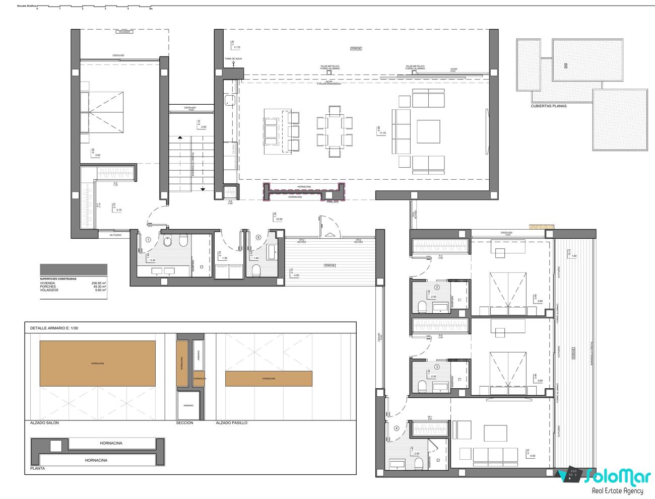 La villa cuenta con una amplia terraza con piscina infinita, ideal para disfrutar del estilo de vida mediterráneo. En su interior, destacan 3 dormitorios con acceso directo a la terraza, incluyendo una suite principal con vestidor y baño privado.