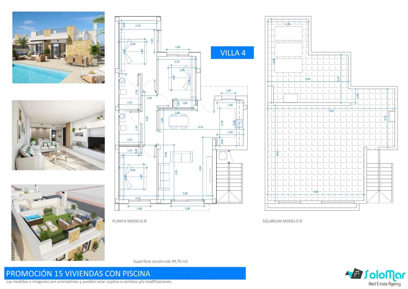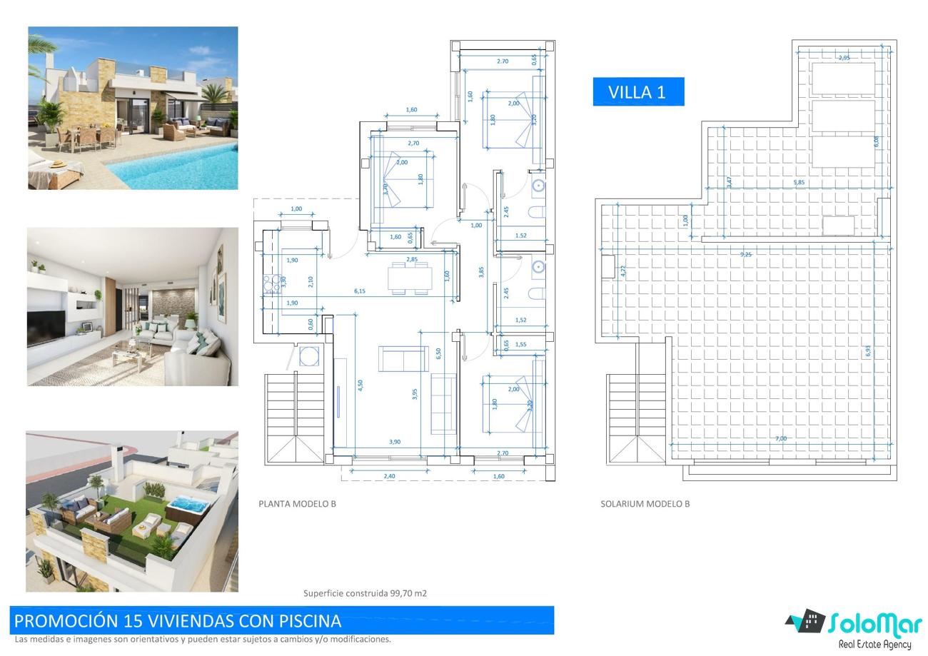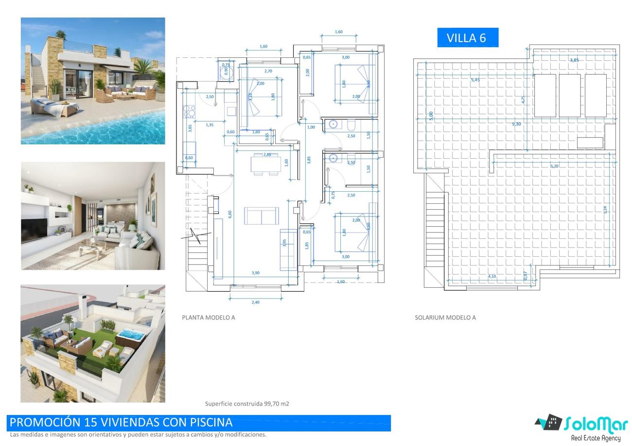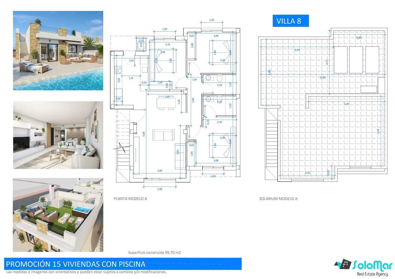 Con una superficie de 99 m² en una sola planta, las villas cuentan con salón abierto con cocina, tres dormitorios con armarios empotrados y dos baños, uno de ellos en suite.