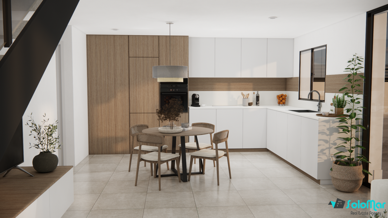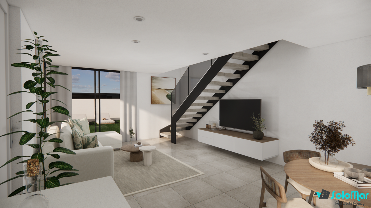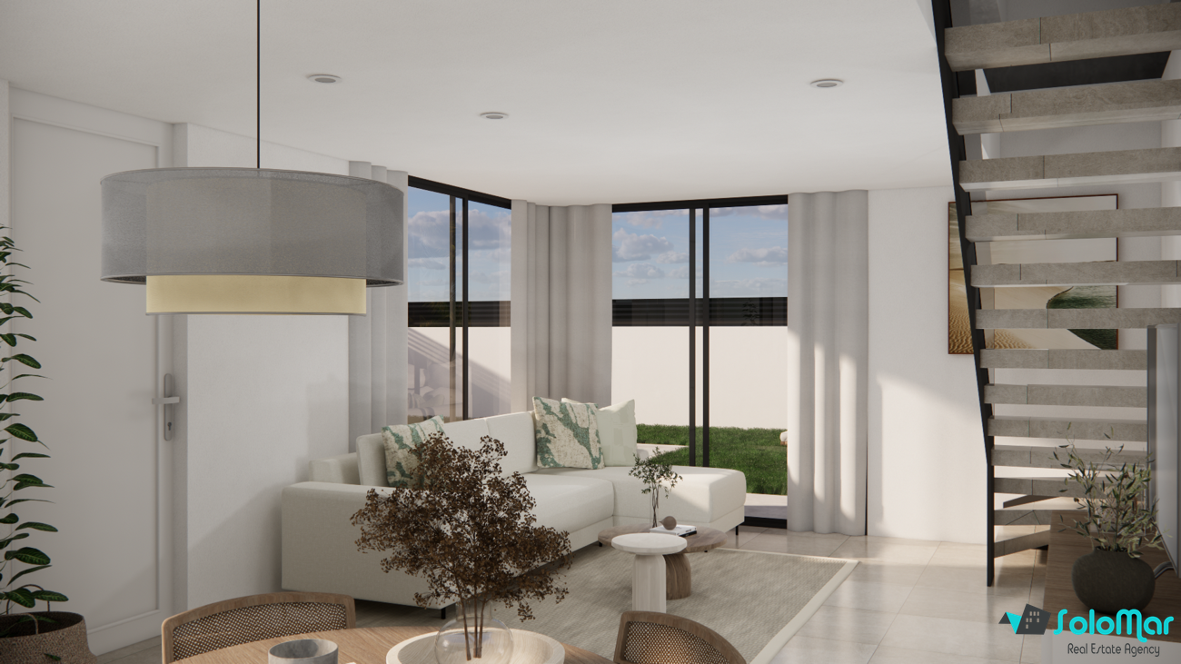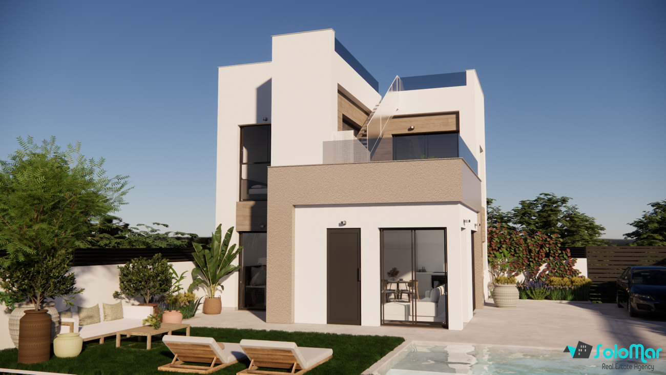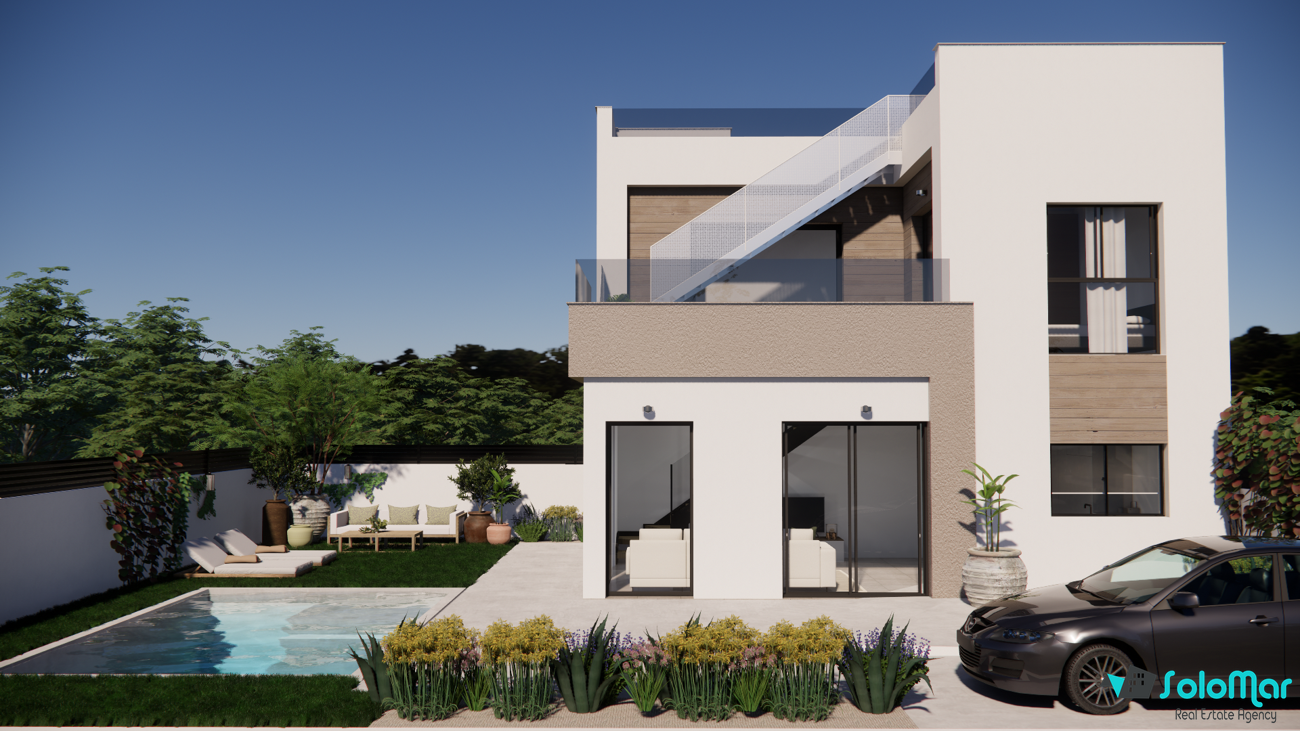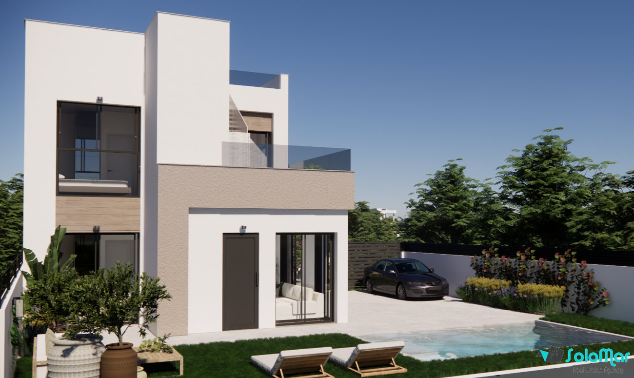Cada villa cuenta con tres dormitorios dobles con armarios empotrados, dos baños completos, una cocina abierta totalmente equipada y un luminoso salón con acceso directo al jardín privado, que incluye piscina y zona de aparcamiento con portón motorizado. La planta superior dispone de una terraza descubierta y, como opción adicional, se puede incorporar un solárium en la azotea para disfrutar del clima mediterráneo durante todo el año.