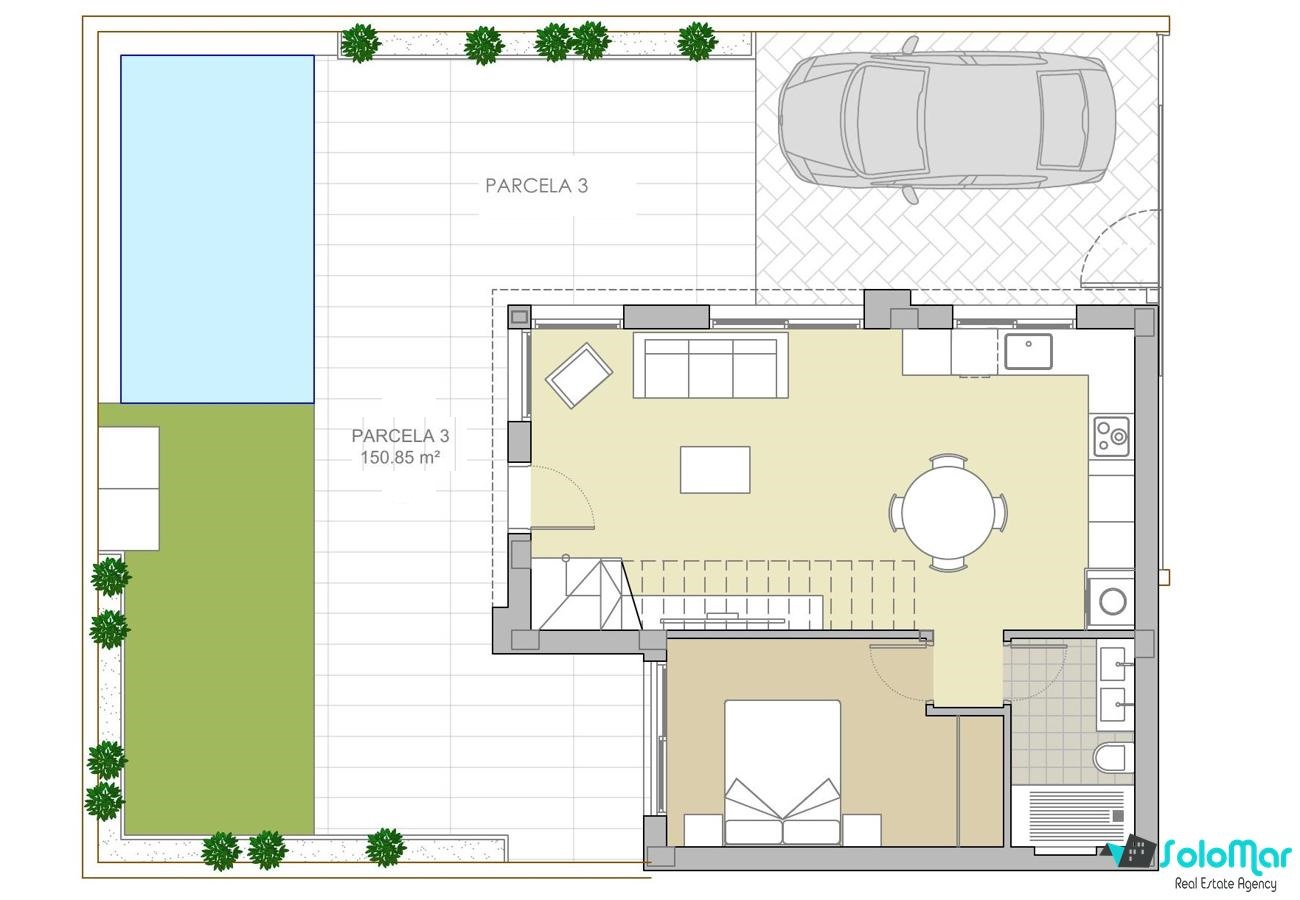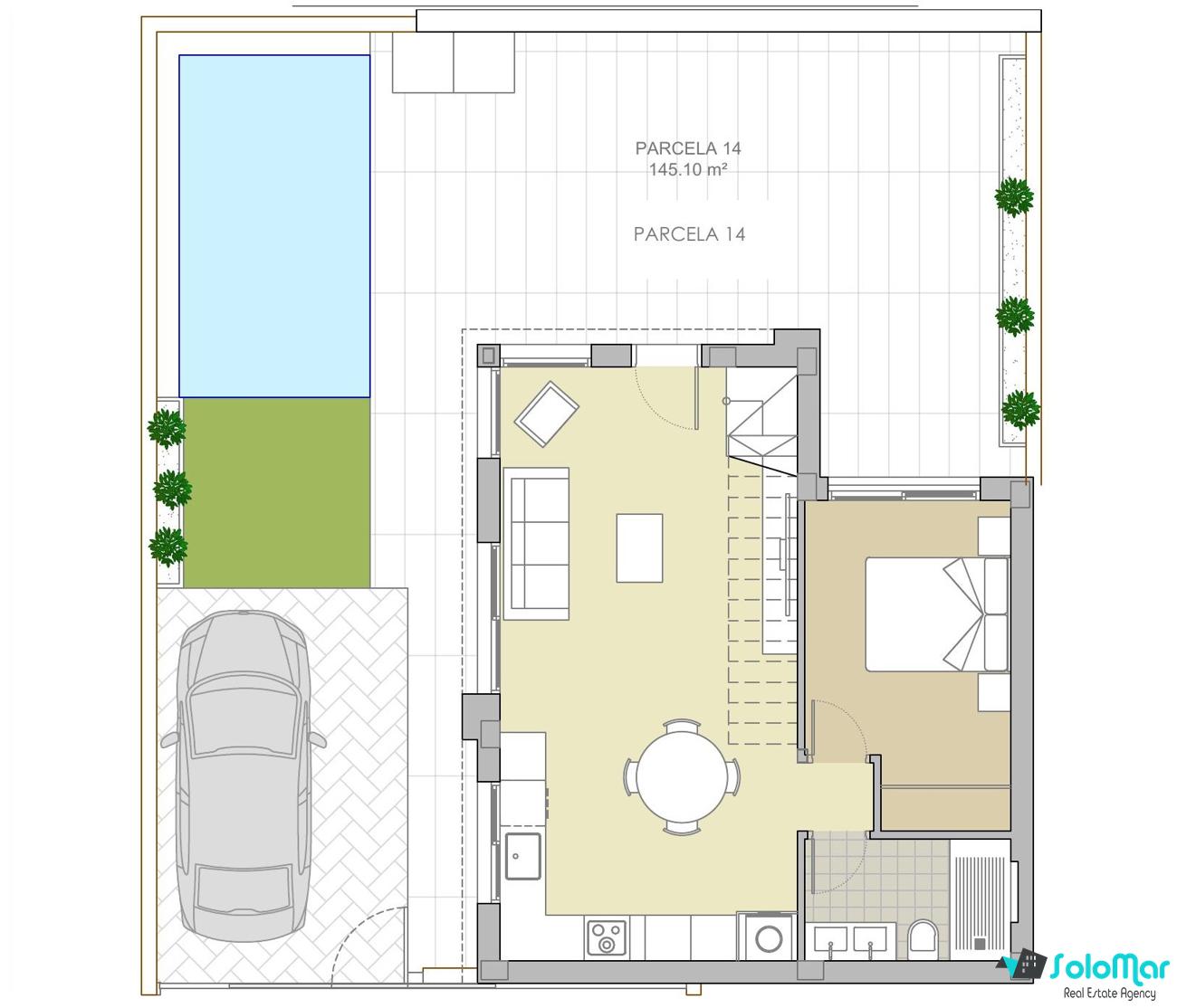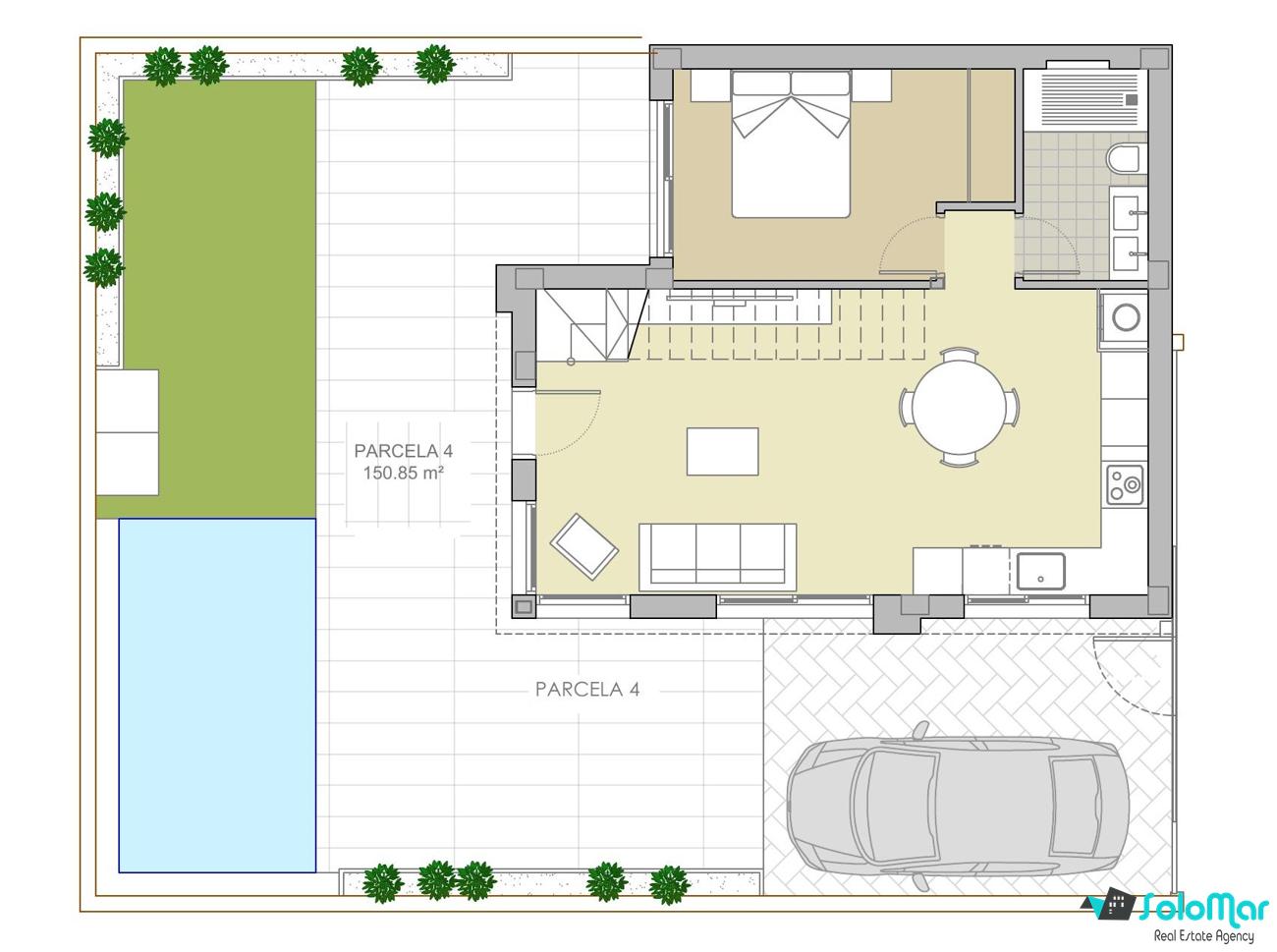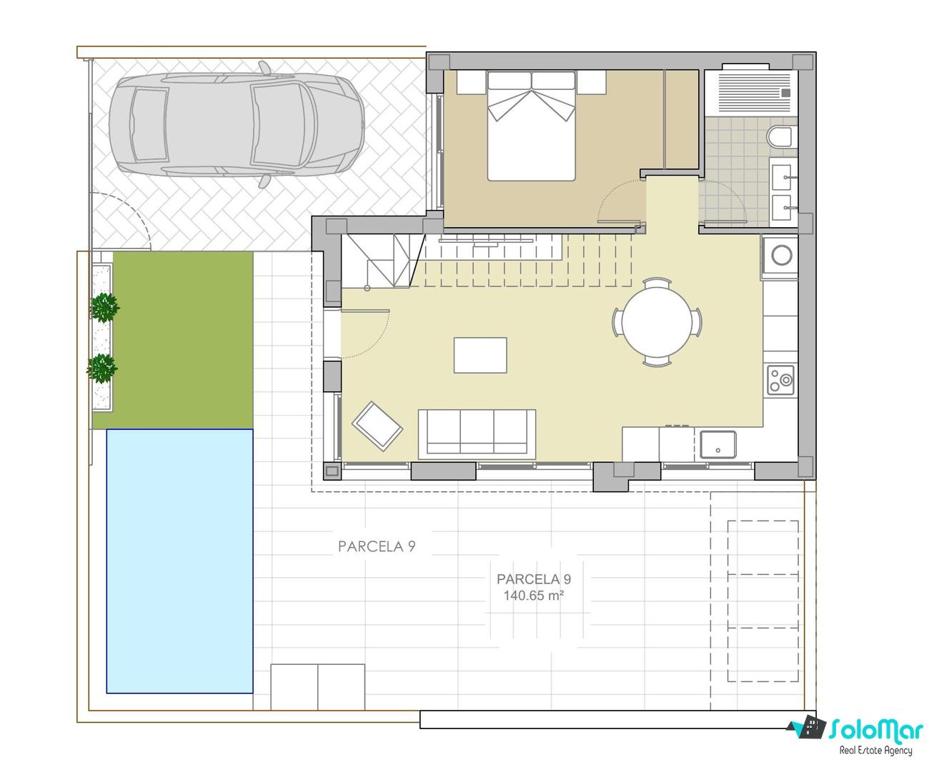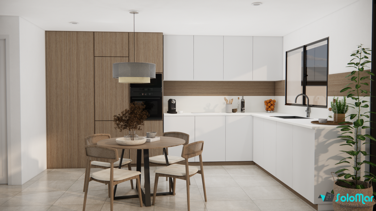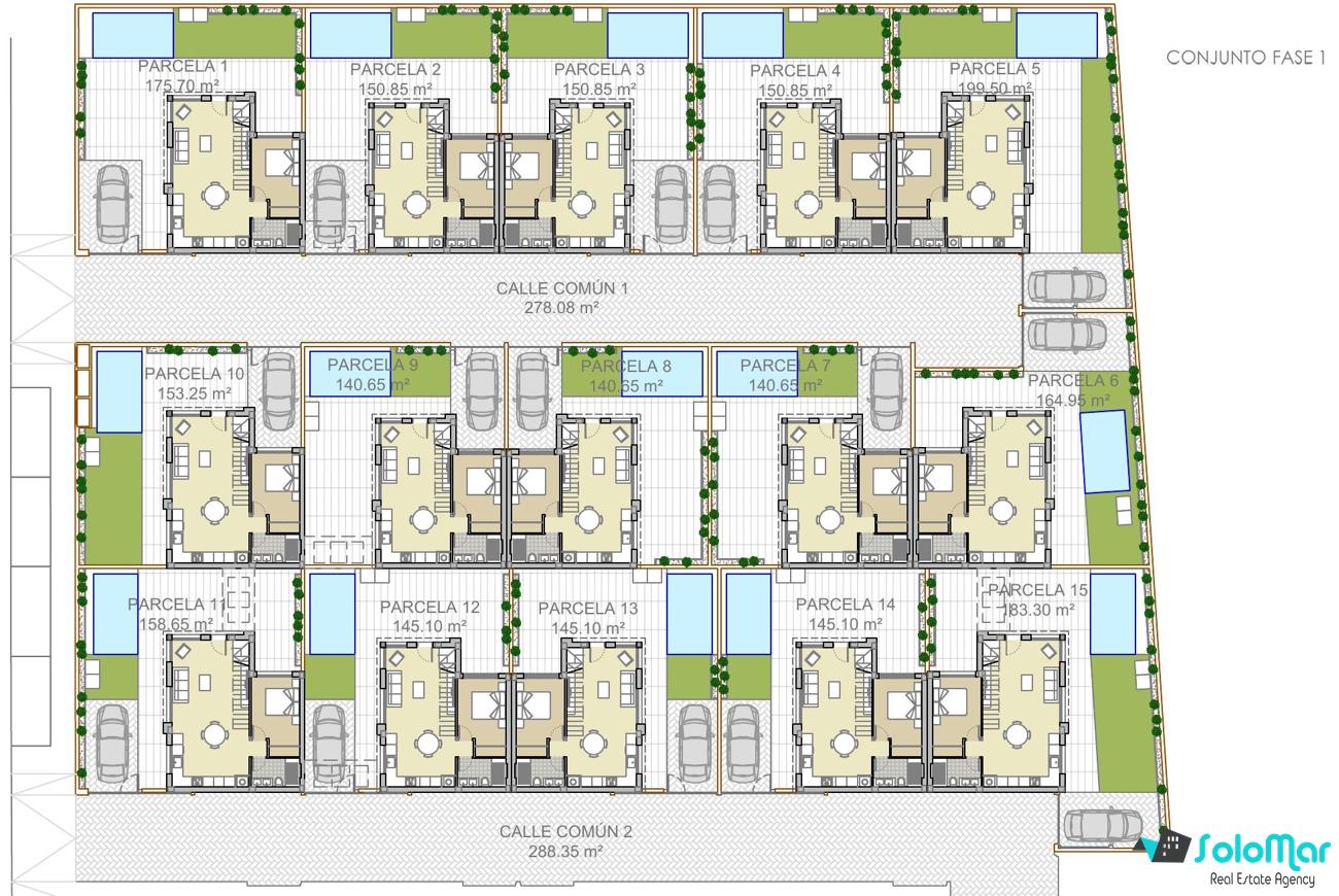 Cada villa cuenta con tres dormitorios dobles con armarios empotrados, dos baños completos, una cocina abierta totalmente equipada y un luminoso salón con acceso directo al jardín privado, que incluye piscina y zona de aparcamiento con portón motorizado. La planta superior dispone de una terraza descubierta y, como opción adicional, se puede incorporar un solárium en la azotea para disfrutar del clima mediterráneo durante todo el año.