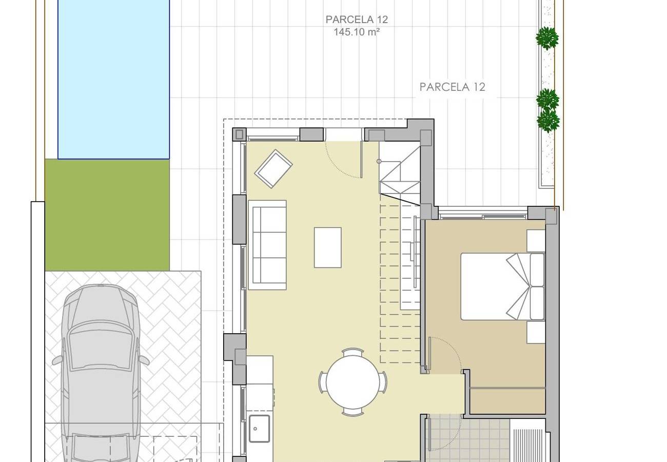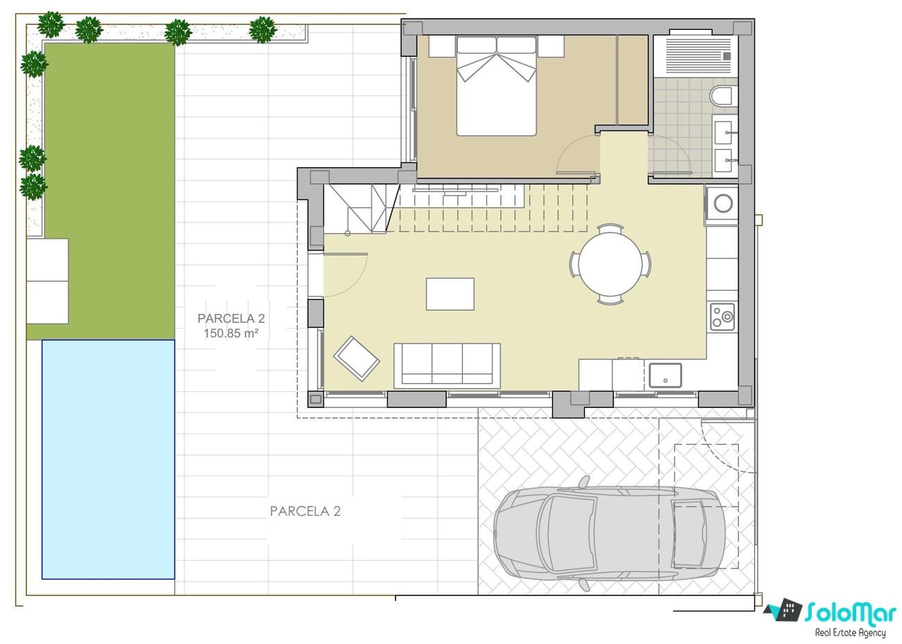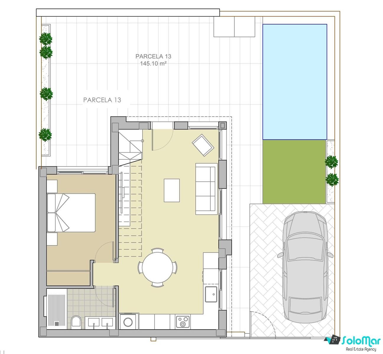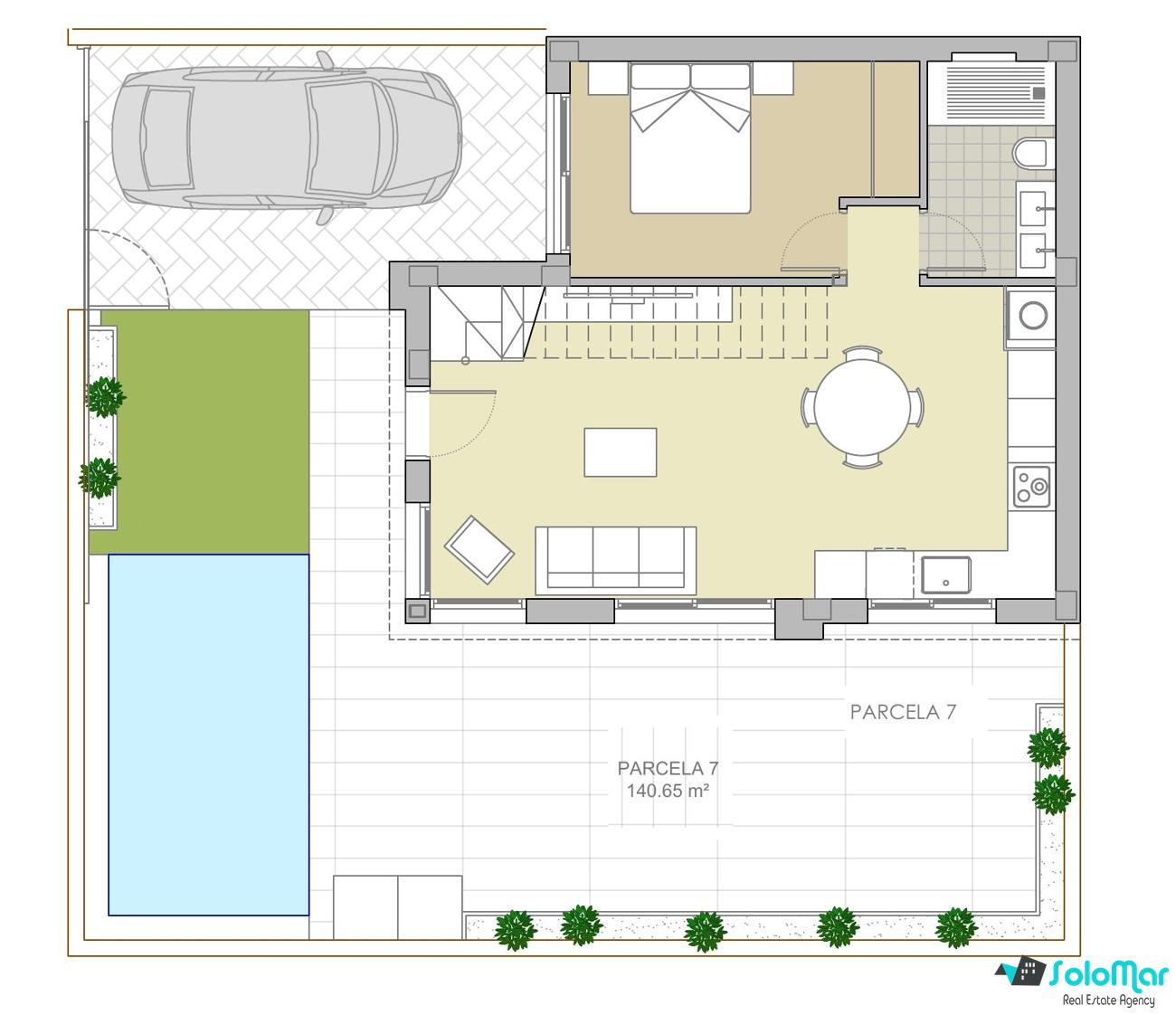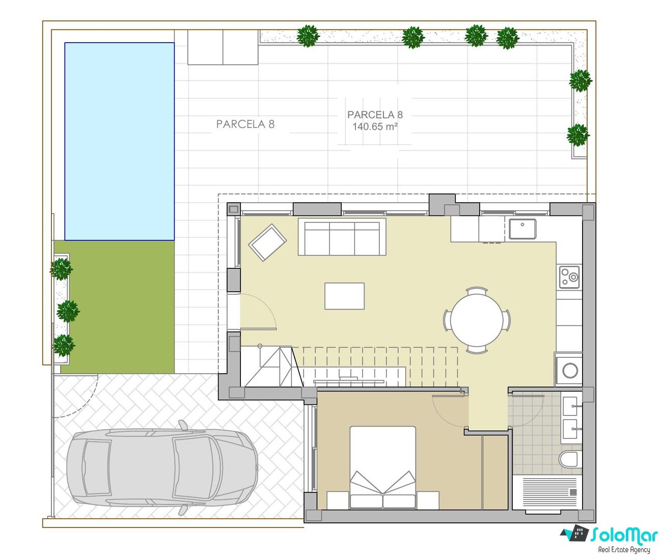 Cada villa cuenta con tres dormitorios dobles con armarios empotrados, dos baños completos, una cocina abierta totalmente equipada y un luminoso salón con acceso directo al jardín privado, que incluye piscina y zona de aparcamiento con portón motorizado. La planta superior dispone de una terraza descubierta y, como opción adicional, se puede incorporar un solárium en la azotea para disfrutar del clima mediterráneo durante todo el año.
