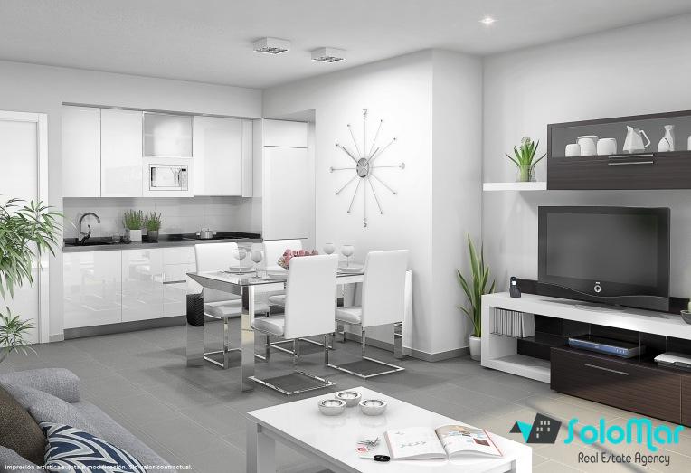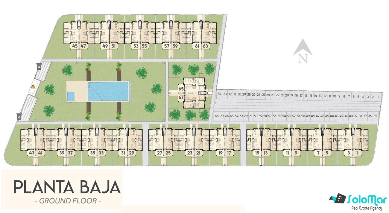 Las viviendas se integran en una urbanización que cuenta con un gran jardín de césped natural de aproximadamente 1.735 m², piscina comunitaria con zona de spa, área infantil, y jardines adicionales con palmeras y otras especies vegetales. Todo ello crea un entorno ideal para disfrutar del sol durante todo el año en familia o con amigos.