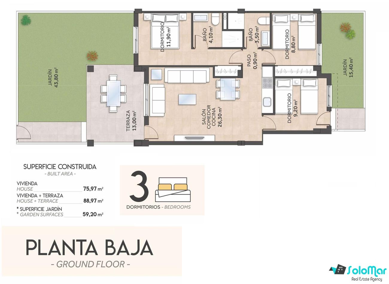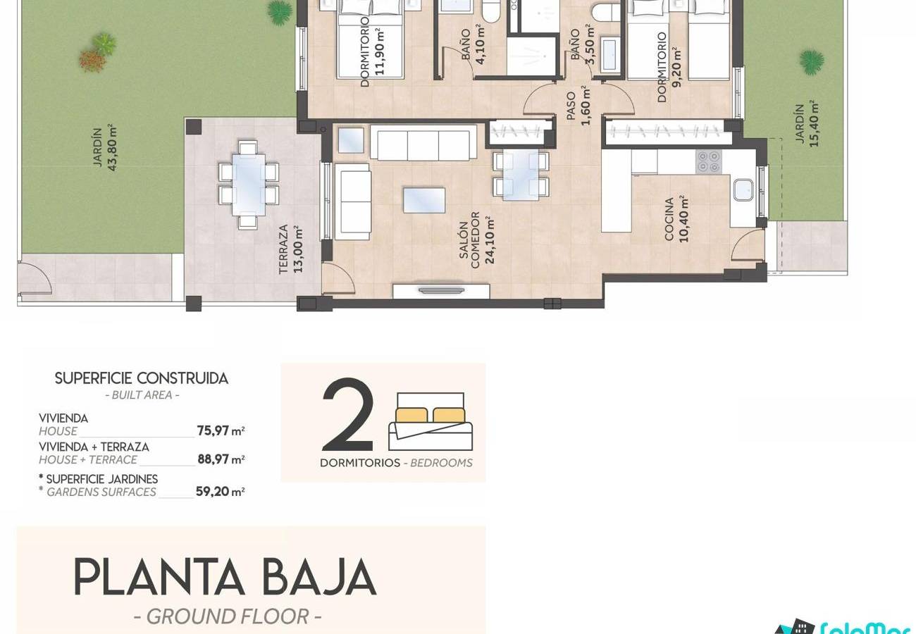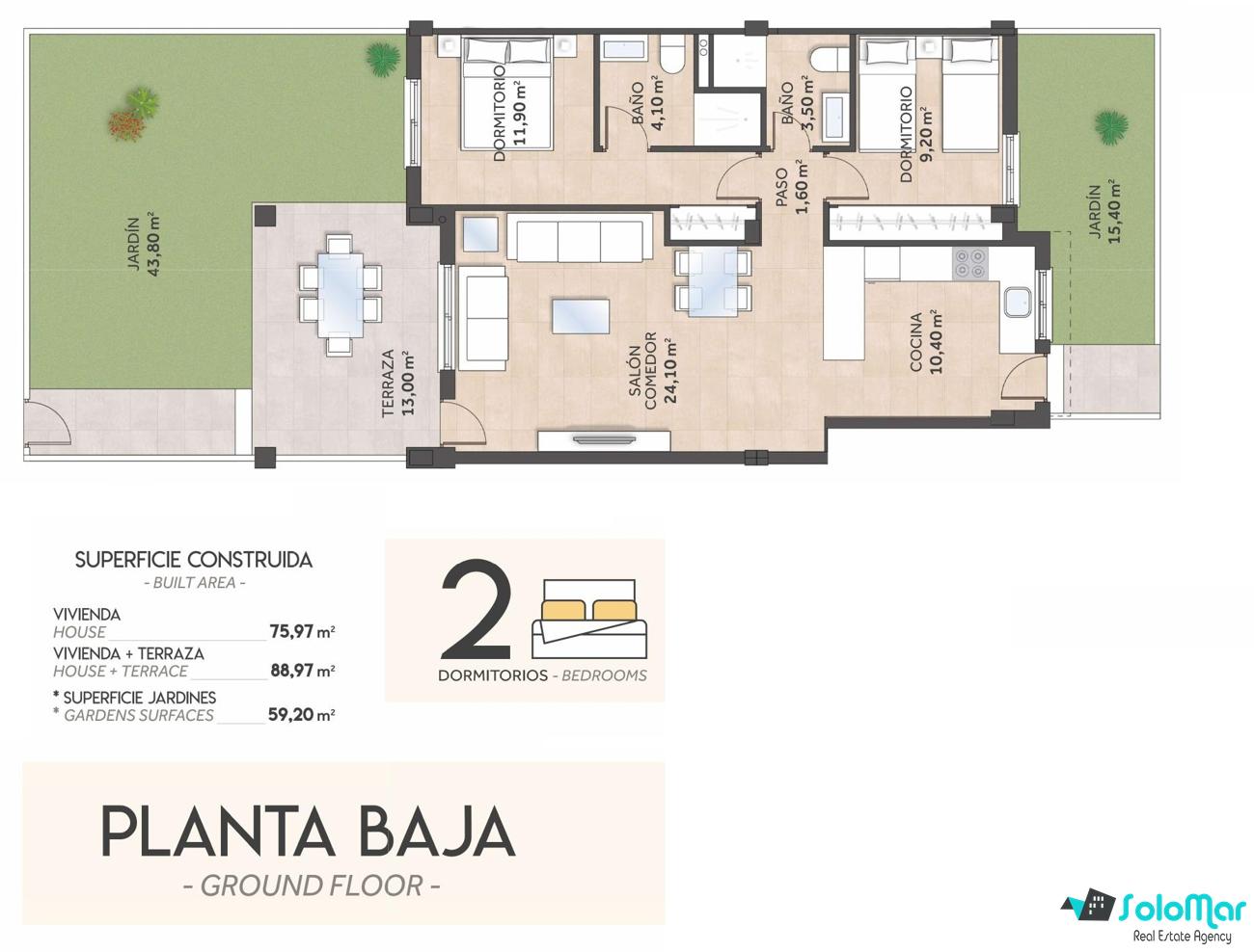 ➤ Planta baja: viviendas con dos dormitorios, dos baños, amplias zonas ajardinadas en la parte delantera y trasera, y plaza de aparcamiento en superficie.