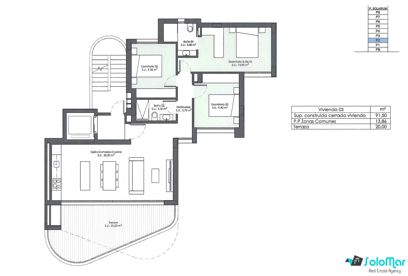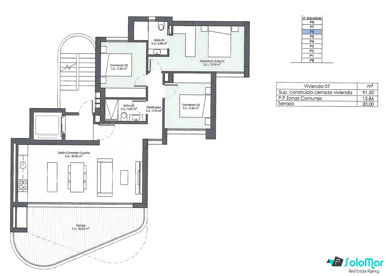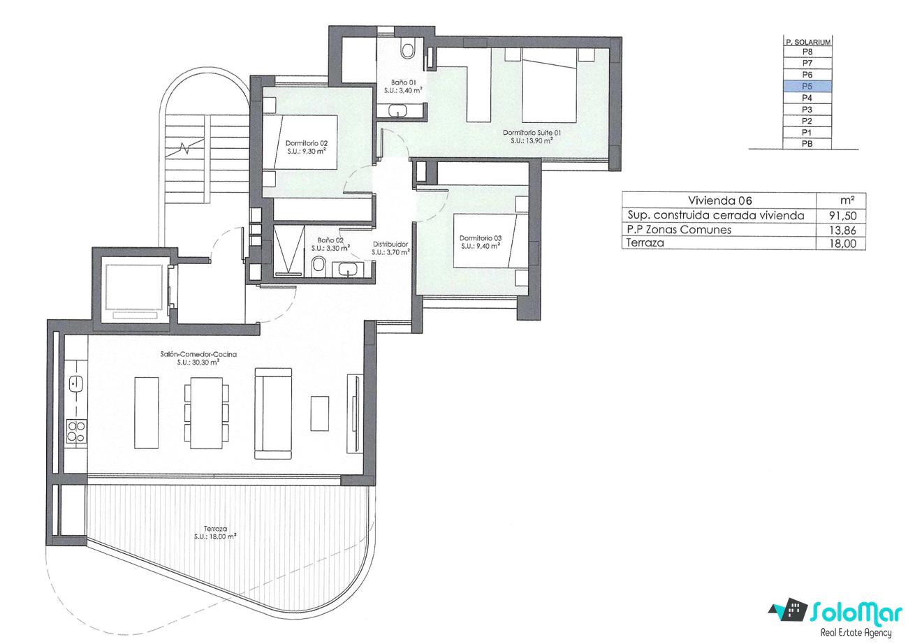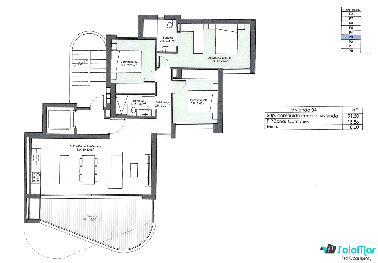 Каждая квартира включает три спальни и две ванные комнаты, с планировкой, разработанной для максимального использования естественного освещения. Квартиры на первом этаже располагают частным садом площадью 120 м², квартиры на средних этажах — террасами по 18 м², а пентхаус выделяется впечатляющей террасой с приватным солярием площадью 78 м².