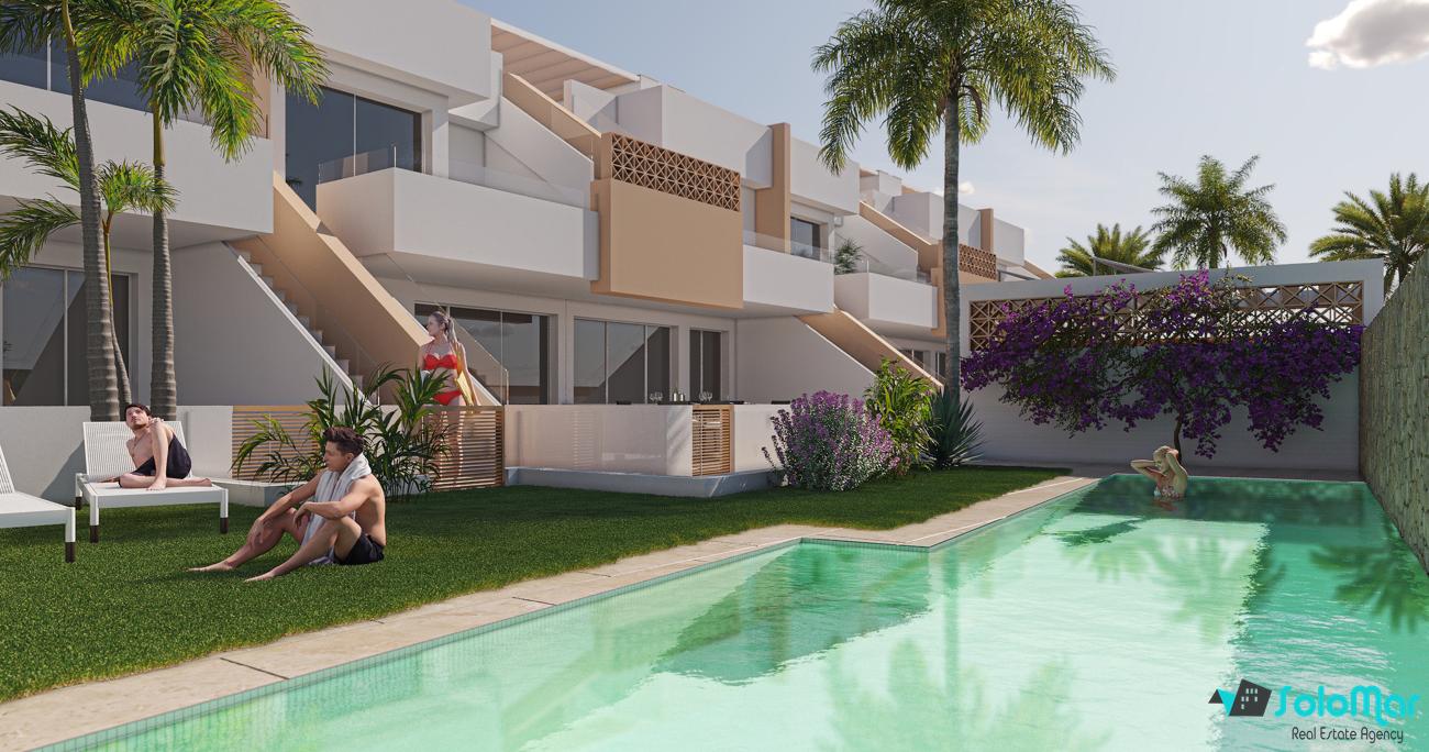 Новые бунгало с террасой и солярием, с 2 спальнями и 2 ванными комнатами, с отделкой класса люкс и общей зоной с бассейном.