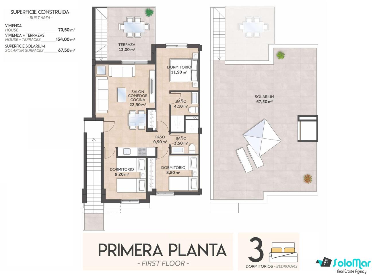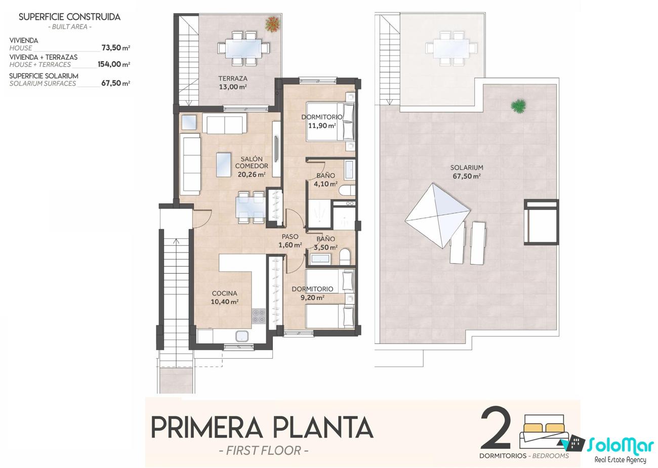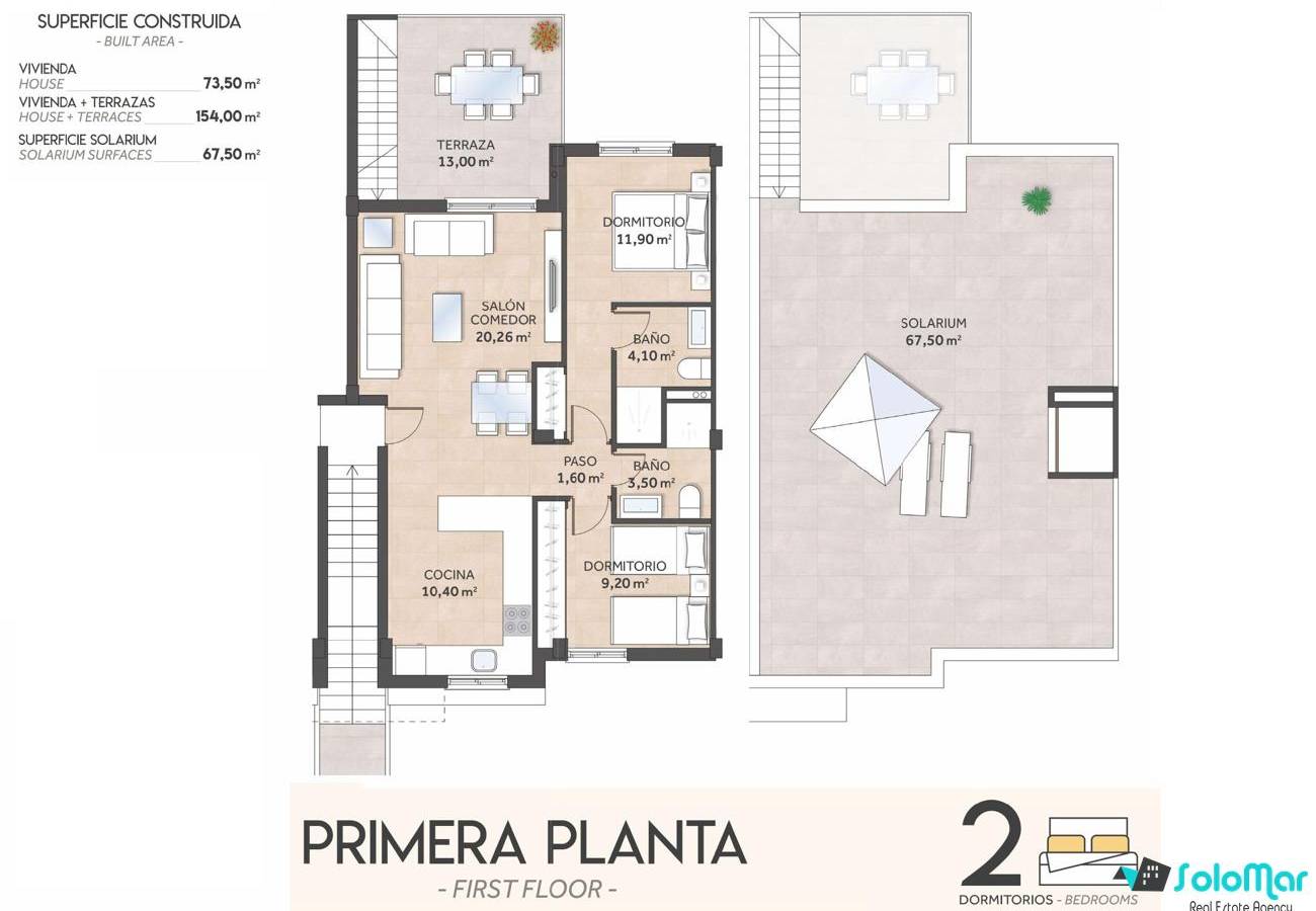 ➤ Верхний этаж: квартиры с двумя спальнями, двумя ванными комнатами, большой частной солнечной террасой (solárium) и парковочным местом. Из квартир на верхнем этаже открывается вид на море.